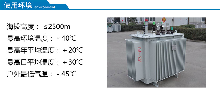 此類產品適用于交流50(60)Hz,可在戶內(外)使用,容量在315kVA 及以下時可安裝在桿上,環境溫度不高于40℃,不低于-25℃,最高日平均溫度30℃,最高年平均溫度20℃,相對濕度不超過90%(環境溫度25℃),海拔高度不超過1000m。